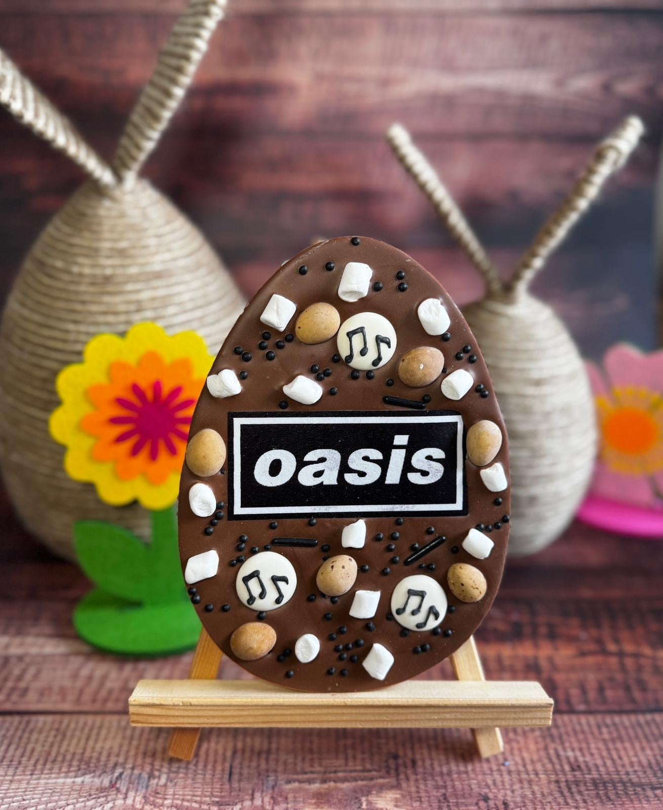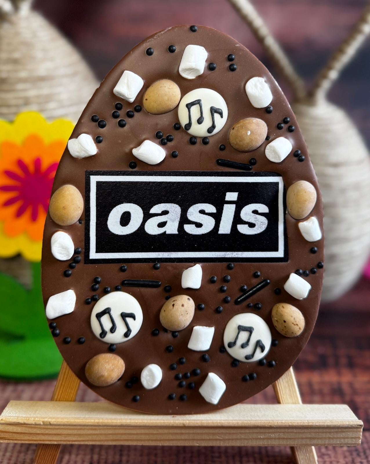 This luxury Belgian chocolate Oasis themed egg is decorated with edible icing, sprinkles and chocolate eggs.